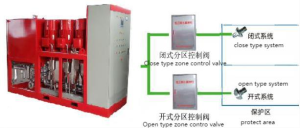 The water mist fire extinguishing device consists of a high-pressure water mist special water storage tank, a water mist fire extinguishing device pump unit (including high-pressure main pump, high-pressure backup pump, voltage stabilizer pump, pump unit control cabinet, water inlet solenoid valve, water inlet filter It is composed of water supply system, water supply pipe network, partition control valve box group of water mist fire extinguishing device, water mist sprinkler, high pressure water mist pipeline and fire detection and alarm system. It works as follows: