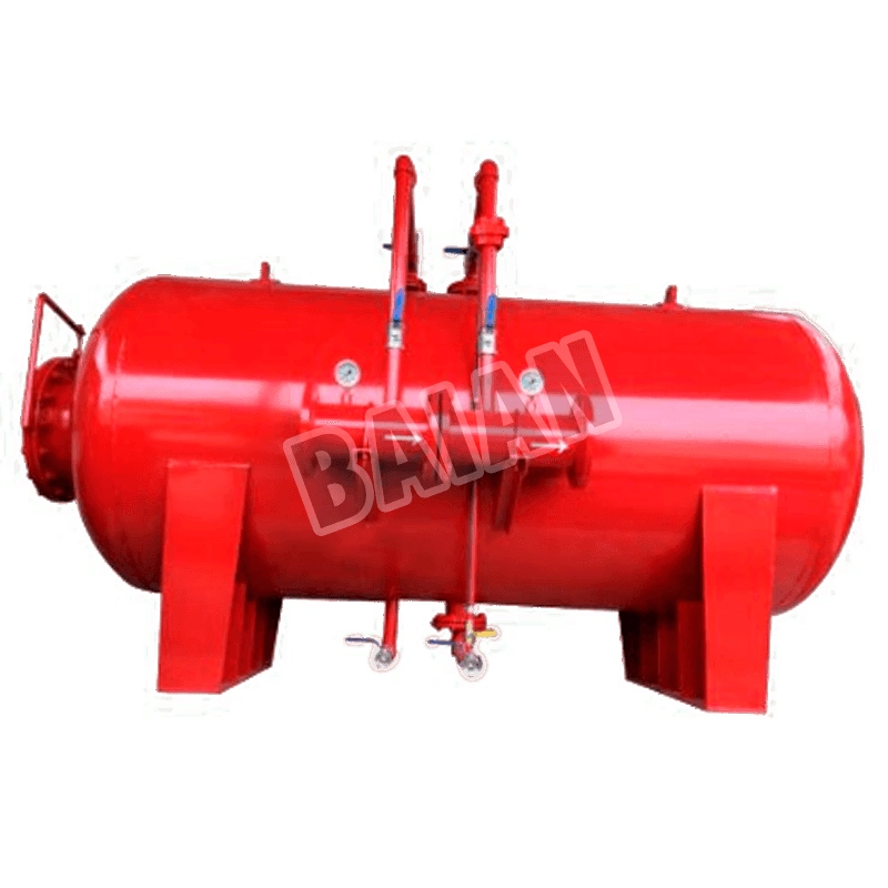 The Fixed Foam Bladder Tank Horizontal Type features a manual structure, proportioner flange to ANSI/BS4504/GB standards, carbon steel valve body with rubber liner, and carbon steel proportioner, ball valve, safety valve, and pipeline system (SS304 stainless steel optional for all).