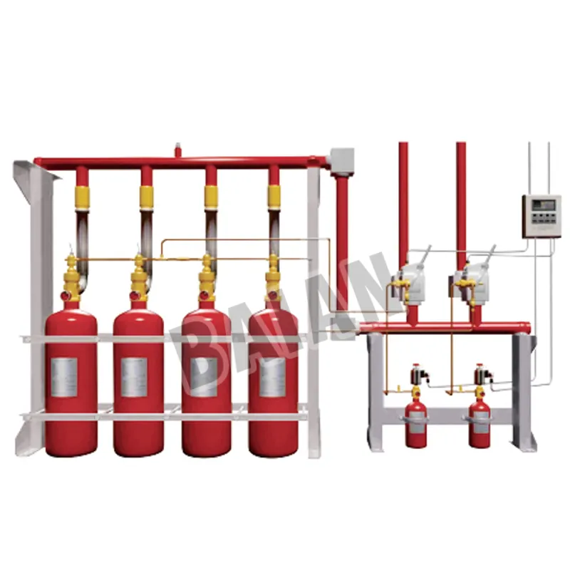 The HFC-227ea fire extinguishing system consists of a cylinder rack, extinguishing agent cylinders, propellant gas cylinders, high-pressure hose, liquid check valve, manifold, safety relief device, low-release, high-sealing valve, selector valve, gas check valve, signal feedback device, and electromagnetic drive nozzle.